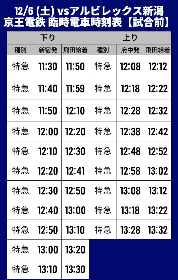 Am Sa., 05.12.2025, im Rahmen der 38. Runde der Meiji Yasuda J1 League gegen Albirex Niigata (Anpfiff 14:00 / Ajinomoto Stadium) informieren wir über den Sonderverkehr (Bahn), Shuttlebusse und Linienbusse.