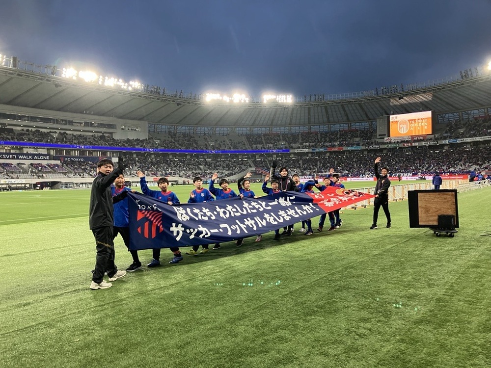 In der Halbzeitpause nutzten wir die Zeit, um mit dem Schulbanner von FC Tokyo für die Schule zu werben!