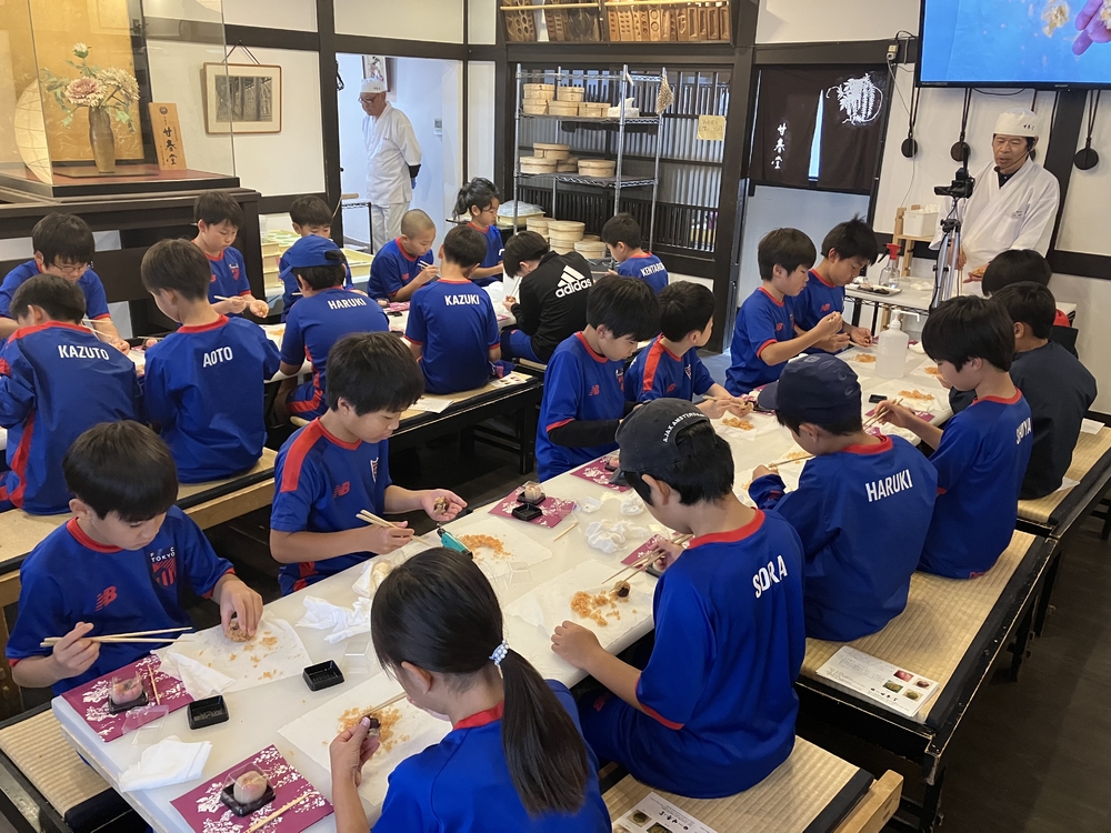 Zum Schluss durften wir alle gemeinsam beobachten, wie der Meister Wagashi herstellte, und die Kinder waren von der meisterhaften Technik des Meisters begeistert und riefen: „Wow!!“ Zum Abschluss machten wir vor dem Laden ein Gruppenfoto zusammen mit dem Meister.