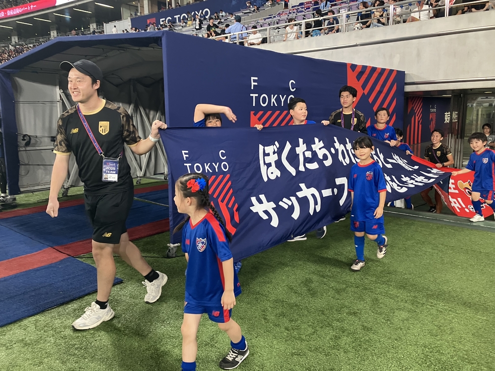 Zur Halbzeit umrundeten die Erst- und Sechstklässler der Schule energiegeladen das Spielfeld, während sie das Banner der FC Tokyo Fußball- und Futsal-Schule hochhielten.