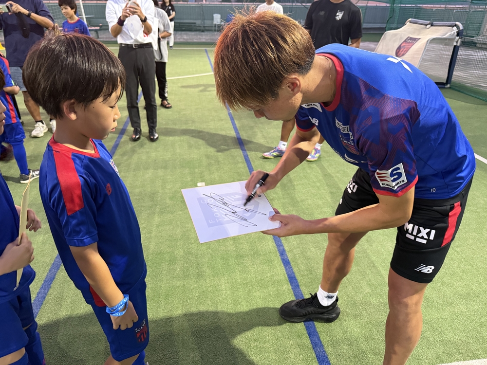 Anschließend unterschrieben alle auf mitgebrachte Autogrammkarten, Taschen und das Trikot von Spieler Hashimoto, und überreichten das von AJINOMOTO CO., INC. bereitgestellte „Guts Gear“!