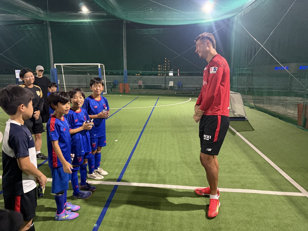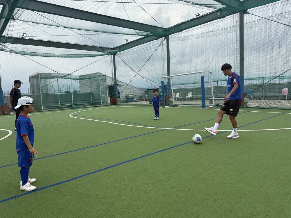 Die Schüler hörten aufmerksam auf die Worte von Spieler Higashi, wie wichtig der Winkel des Fußes, die Kraftdosierung und die Nutzung beider Füße ist, und es war sehr beeindruckend zu sehen, wie sie sich konzentrierten und sagten: „Ich werde es so machen, wie es mir beigebracht wurde!“