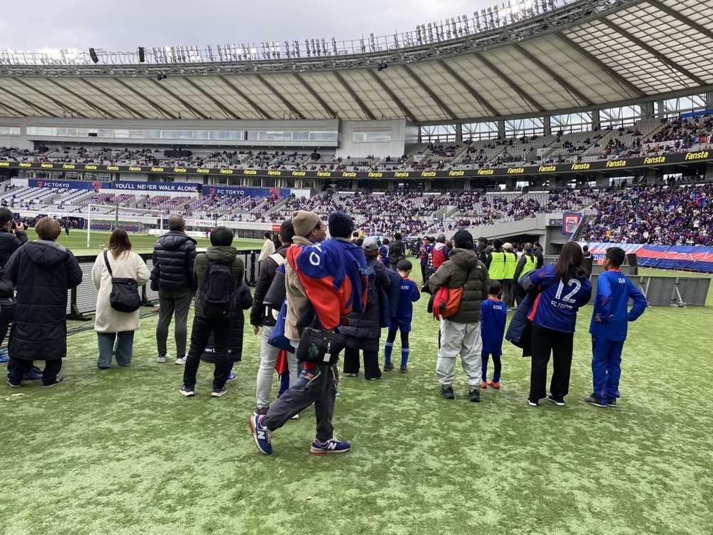 Während der Beobachtung des Aufwärmens vergaßen die Schüler die Kälte, da sie den Spielern leidenschaftlich zujubelten und genossen die Aussicht auf das Ajinomoto Stadium sowie die Atmosphäre im Stadion vom Spielfeldniveau aus.