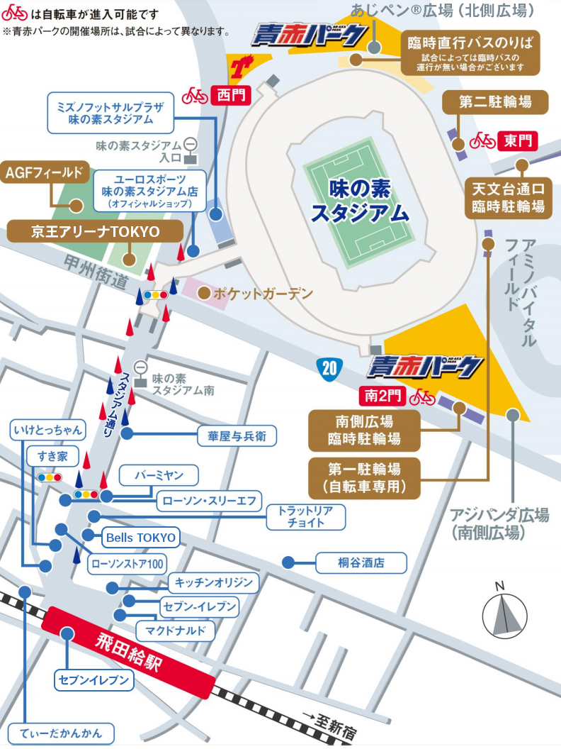 - To alleviate congestion for cyclists and pedestrians on the east side road of Ajinomoto Stadium after the match, please use the designated "Pedestrian Route" and "Bicycle Route" for passage.