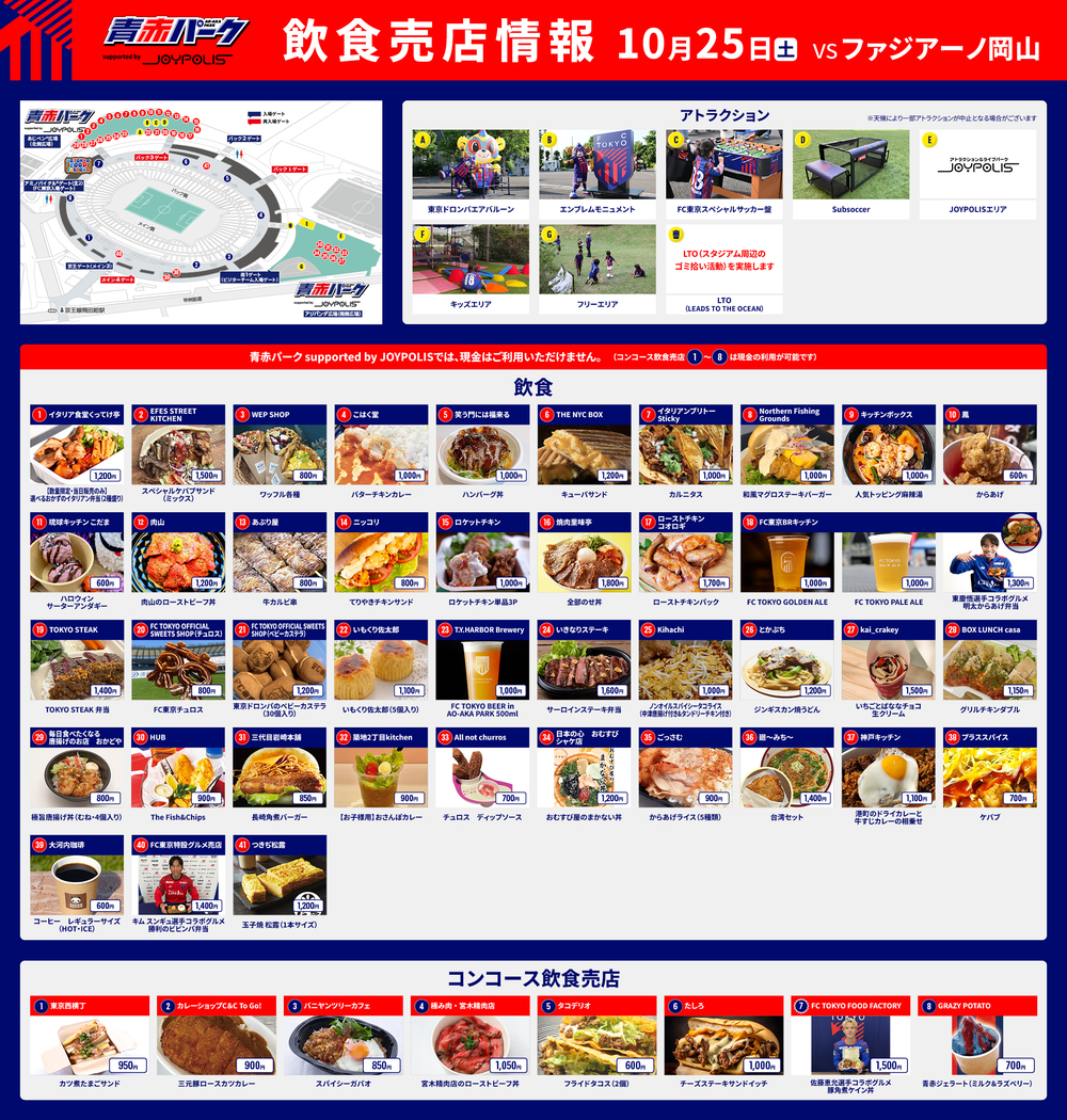 Saturday, October 25, 2025 Meiji Yasuda J1 League Sec. 35 vs Fagiano Okayama (Kickoff 14:00 / Ajinomoto Stadium), AO-AKA PARK supported by JOYPOLIS (outside the stadium) will be on site!! We will inform you about the food and beverage information sold at AO-AKA PARK supported by JOYPOLIS and the concession stands inside the stadium concourse (inside the stadium).