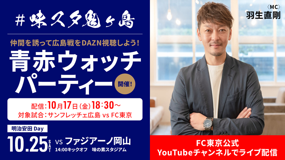 Even those who are not familiar with soccer will surely become "companions" by watching with you, who love FC Tokyo. We will live stream a watch party that can be widely enjoyed by everyone from soccer viewing beginners to FC Tokyo fans and supporters. Please invite your friends and family and enjoy this live stream while watching DAZN.