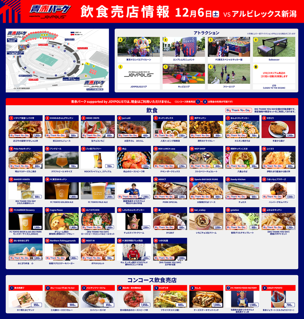 Saturday, December 6, 2025 Meiji Yasuda J1 League Round 38 vs Albirex Niigata (Kickoff 14:00 / Ajinomoto Stadium), AO-AKA STREET, AO-AKA PARK supported by JOYPOLIS (outside the stadium), and AO-AKA PARK supported by JOYPOLIS, as well as concession stands inside the stadium concourse, will offer food and drink information.