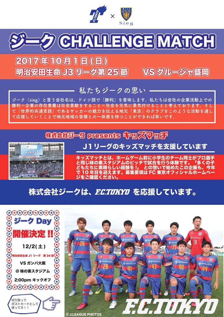 This time, FC Tokyo U-23 will hold the 'Sieg CHALLENGE MATCH' in cooperation with club sponsor 'Sieg Corporation' during the match against Grulla Morioka in Sec. 25 of the 2017 Meiji Yasuda Life Insurance Company J3 League, which will be held on 10/1 (Sun).