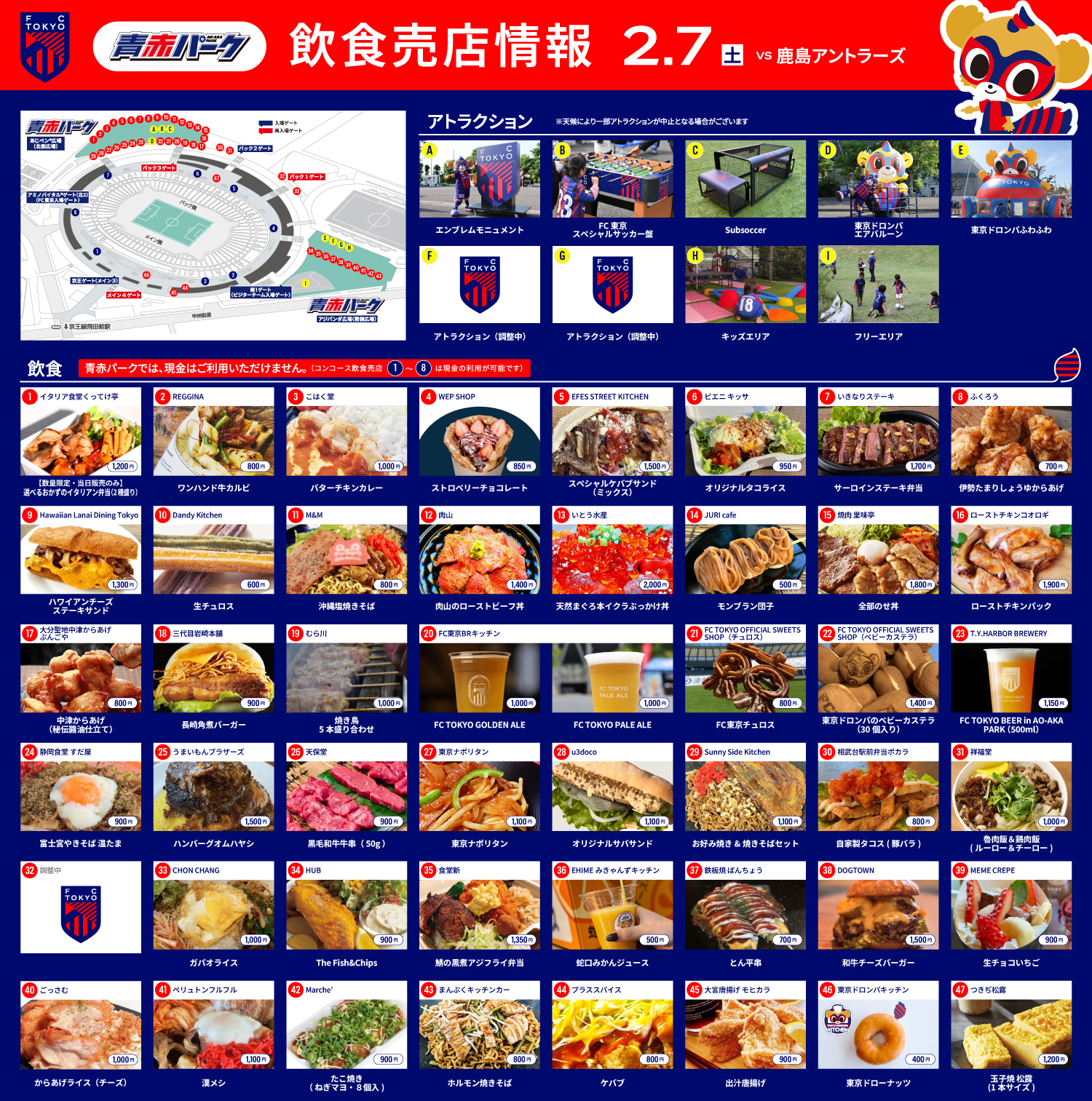 February 7 (Sat) Meiji Yasuda J1 Century Vision League Sec. 1 vs Kashima Antlers (Kickoff 13:30 / Ajinomoto Stadium), AO-AKA PARK (outside the stadium) will be on site!! We will inform you about food and drink available for sale at AO-AKA PARK and the stadium concourse (inside the stadium) shops.