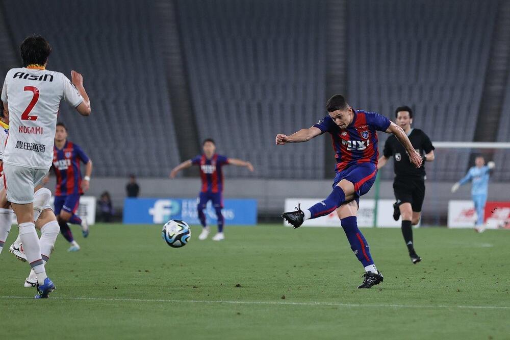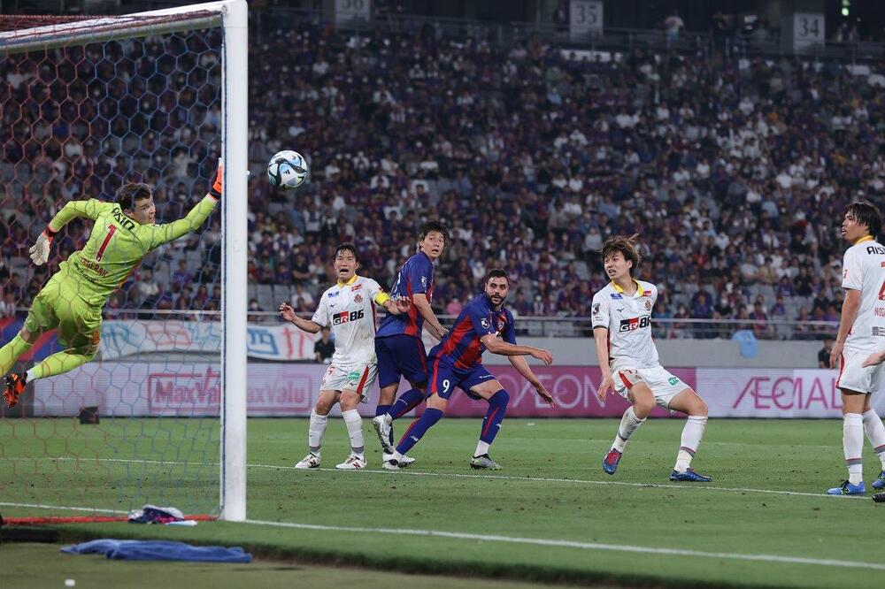 전방에서의 하이 프레셔는 나고야로부터 빌드업의 정확도와 속도를 빼앗고, 반대로 도쿄가 높은 위치에서 볼을 빼앗아 두텁게 공격을 개시할 계기를 만든다. 후반 13분에는 두세 번 높은 위치에서 볼을 계속 빼앗아 코너킥을 얻었고, 마츠키 선수가 넣은 볼을 타바 디에고 선수가 절묘한 헤딩으로 맞췄지만 슈팅은 아쉽게도 골대 위로 벗어났다.