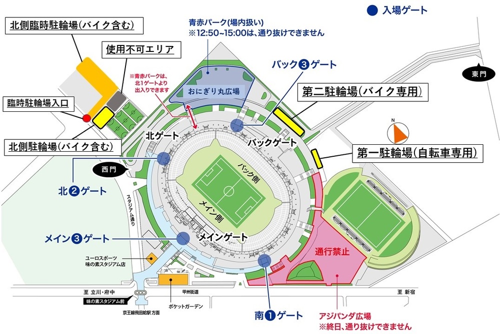※오니기리마루 광장(북쪽 광장)은 12:50~15:00, 아지판다 광장(남쪽 광장)은 종일 통과할 수 없으니, 제1·제2 자전거 주차장을 이용하시는 분은 주의해 주시기 바랍니다.(백 3 게이트에서 입장 가능. 재입장 불가)