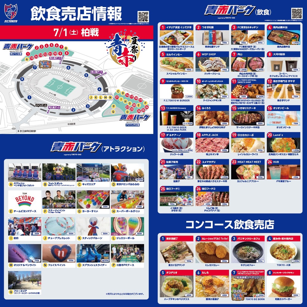 7월 1일(토) 가시와 레이솔전의 아오아카 파크 supported by TOKYO GAS(외부) 및 스타디움 내 콘코스(장내) 매장에서 판매하는 푸드 메뉴입니다.