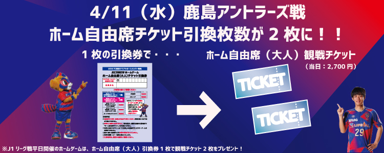 또한, 이번 경기는 평일에 개최되는 리그전이므로, 「홈 자유석 티켓」 교환권 1장으로 티켓 2장과 교환해 드립니다!