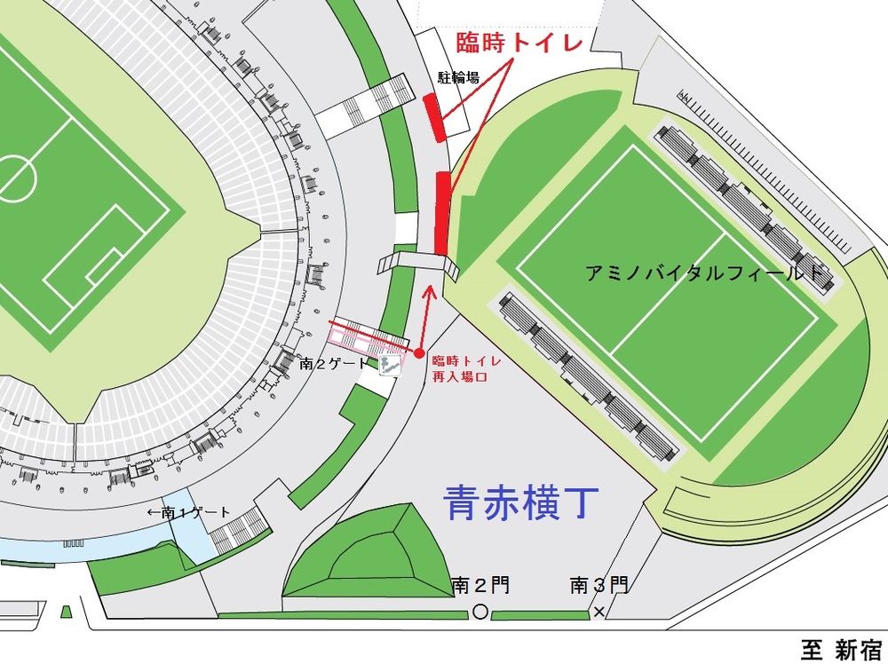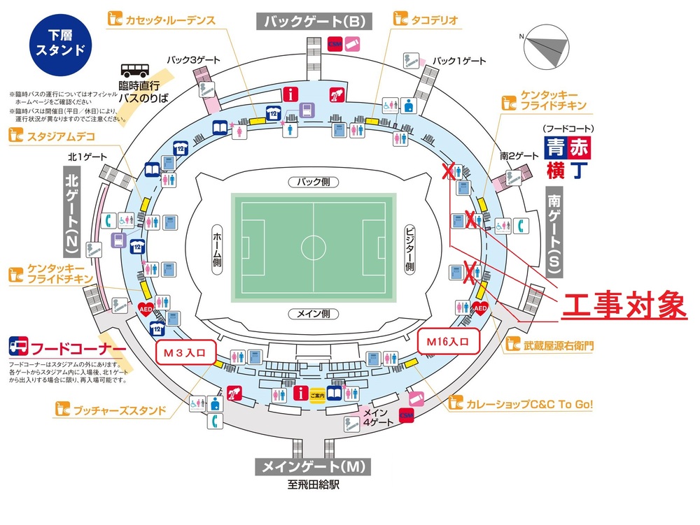 11/24(토) 가와사키 프론탈레전에서는 아지노모토 스타디움 내 화장실 일부(남쪽 스탠드 쪽)가 개수 공사로 인해 사용하실 수 없습니다. 또한 경기장 밖에 임시 화장실을 설치하오니, 이쪽을 이용해 주시기 바랍니다. 불편을 끼쳐 드려 죄송하지만, 여러분의 이해와 협조를 부탁드립니다.