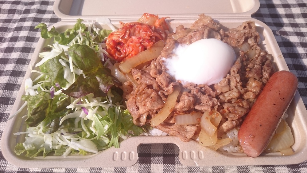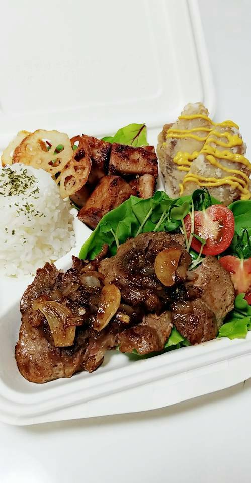 얇게 썬 소 갈비를 철판에 구워, 갈색으로 볶은 양파를 섞고, 특제 비법 소스로 맛을 냈습니다. 샐러드, 김치, 온란이 포함된 도시락입니다. 수량 한정입니다.