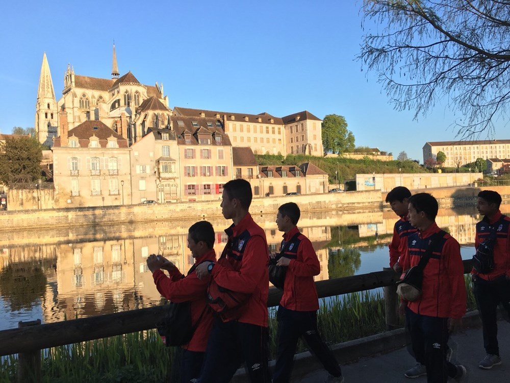 점심도 어제와 같은 아카데미 식당에서 먹고, 드디어 대회가 열리는 상스로 향하는 버스에 탔습니다. 출발 전에는 톱팀이 히로시마에 승리해 선두에 섰다는 소식을 듣고 멤버들의 마음이 더욱 고조되었습니다.