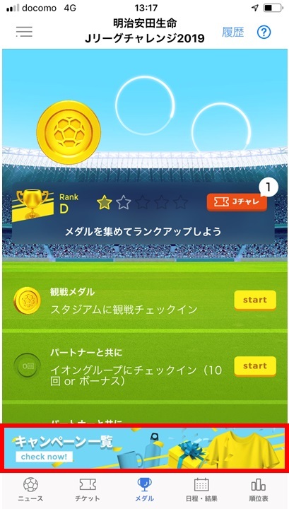 좋아하는 클럽의 뉴스와 경기 정보를 한눈에 확인하고, 스타디움에서 관전(체크인)을 반복하여 메달을 획득하면 "메이지 야스다 생명 J리그 챌린지"에 도전할 수 있으며, 친구를 초대할 수 있는 페어 티켓이나 한정 굿즈 등을 받을 수 있습니다. 또한 메달을 모아 랭크가 올라갈수록 앱 한정 특별 캠페인에 참여할 수 있습니다.