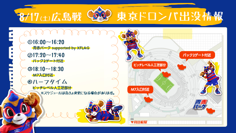 8/17(토) 2019 메이지 야스다 생명 J1리그 제23절 vs 산프레체 히로시마(19:00 킥오프/아지노모토 스타디움)에 도쿄 도롱파가 아래와 같이 나타납니다. 꼭 '도쿄 도롱파'를 만나러 와 주세요!! 기대해 주세요!