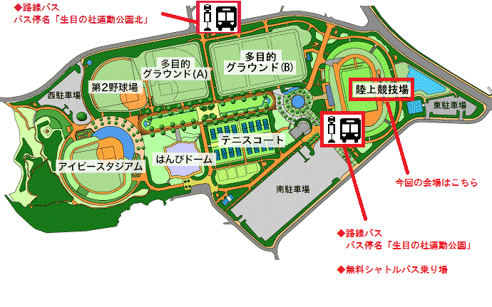 경기 당일, 미야자키역에서 미야자키시 이키메노모리 운동공원 육상경기장까지 무료 셔틀버스를 경기 전(11:30~14:00)과 경기 후(16:00~17:30)에 약 30분 간격으로 운행합니다.