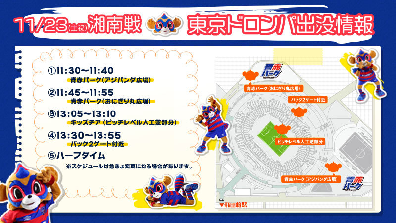 11/23(토공휴) 2019 메이지 야스다 생명 J1리그 제32라운드 vs 쇼난 벨마레(14:00 킥오프/아지노모토 스타디움)에 도쿄 도롱파가 아래와 같이 나타납니다. 꼭 '도쿄 도롱파'를 만나러 와 주세요!! 기대해 주세요!