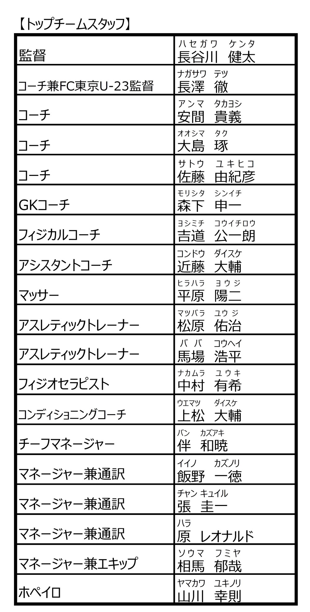 【1/13 추기】2020 시즌 FC 도쿄 톱팀 편성에 대하여 2020/1/10 톱팀 2020 시즌 톱팀 편성을 아래와 같이 알려드립니다. 【1/13 추기】조안 오마리 선수의 등번호·유니폼 네임 표기를 추기했습니다. ※2019 시즌에 클럽을 떠난 스태프: 안 룡진 매니저(주무) ※「AFC 챔피언스리그」 및 「J1리그」의 유니폼 네임 표기는 공통입니다.