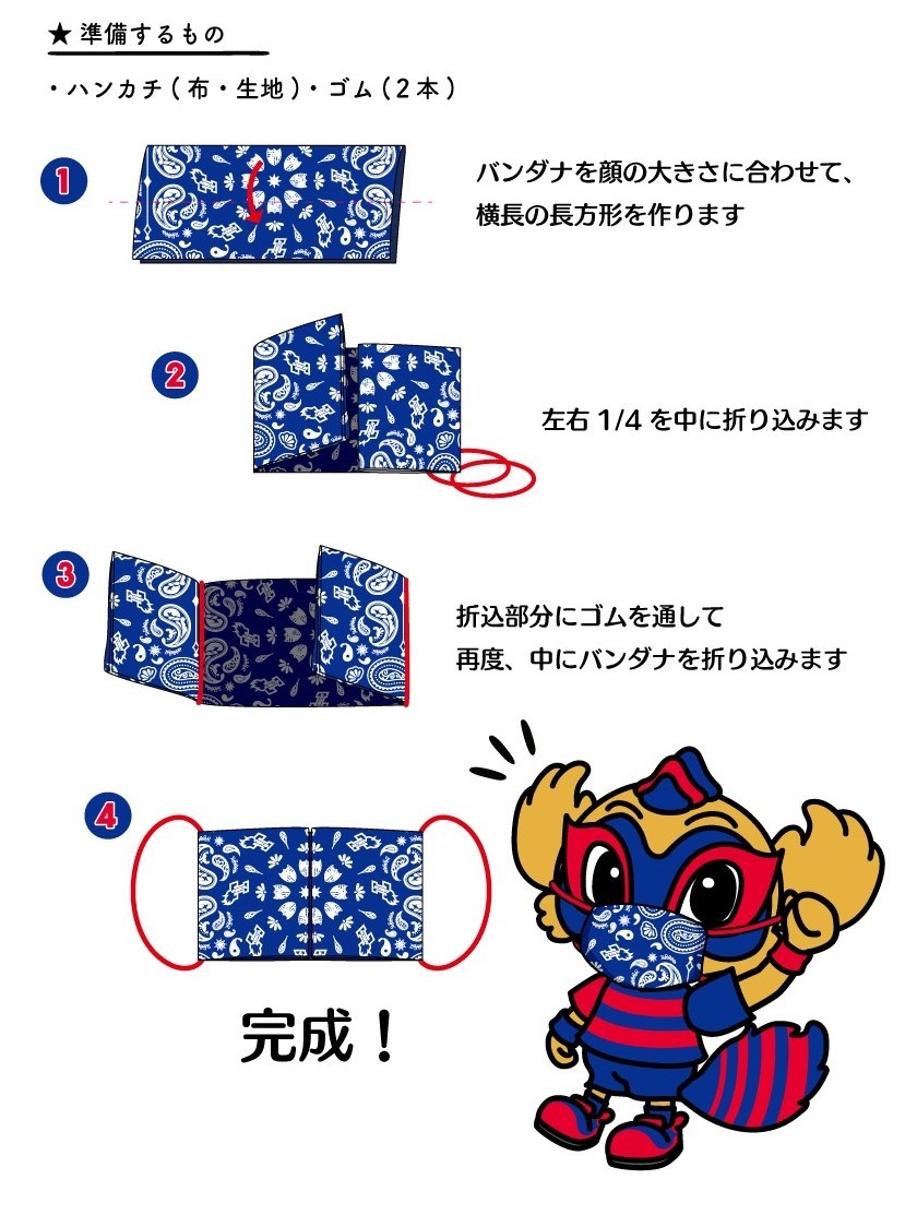 이번에 FC 도쿄에서는 비말 확산 방지 대책 등으로 세탁하여 반복 사용 가능한 ‘반다나’와 ‘천 마스크’를 판매합니다.