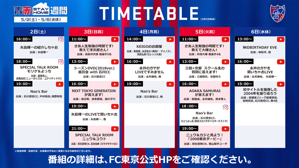 5월 2일(토)부터 5월 6일(수 휴일)까지 기간 동안 『청적 STAY HOME 주간』으로, 팬·서포터 여러분이 집에서 즐기실 수 있도록 영상 LIVE 방송과 선물 캠페인 등 다양한 기획을 실시합니다!