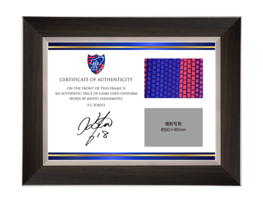(1)유니폼 증명서는 오센틱 유니폼의 사인이 선수 본인의 직필임을 증명하며, 2020 메이지 야스다 생명 J1리그 제1절 vs 시미즈 에스펄스전, 제3절 vs 가와사키 프론탈레전에서 하시모토 선수가 경기에서 착용한 유니폼의 일부를 잘라 천을 증명서에 끼워 넣고 있습니다.