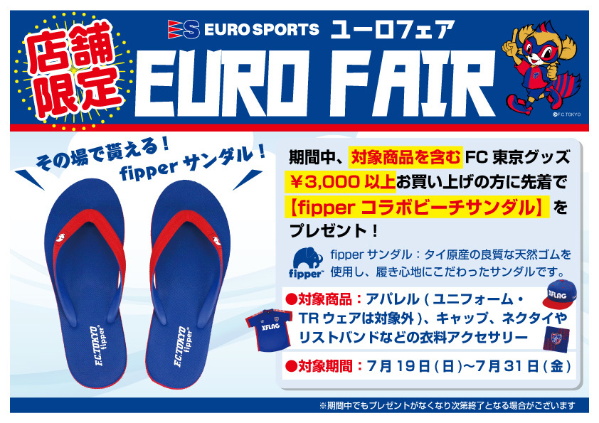 FC 도쿄 공식샵 『유로 스포츠 아지노모토 스타디움점』에서는 의류, 패션 소품을 포함한 FC 도쿄 굿즈를 3,000엔 이상 구매하신 분께 선착순으로 fipper 콜라보 비치 샌들을 선물로 드립니다!!