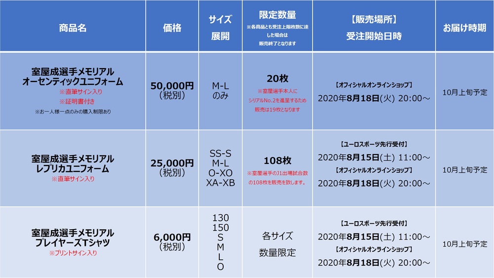 ※「무로야 세이 선수 메모리얼 레플리카 유니폼」과 「무로야 세이 선수 메모리얼 플레이어즈 티셔츠」는 8/15(토) 유로스포츠 아지노모토 스타디움점에서 선행 주문 시작, 8/18(화) 20:00부터 공식 온라인샵에서 주문 시작합니다.