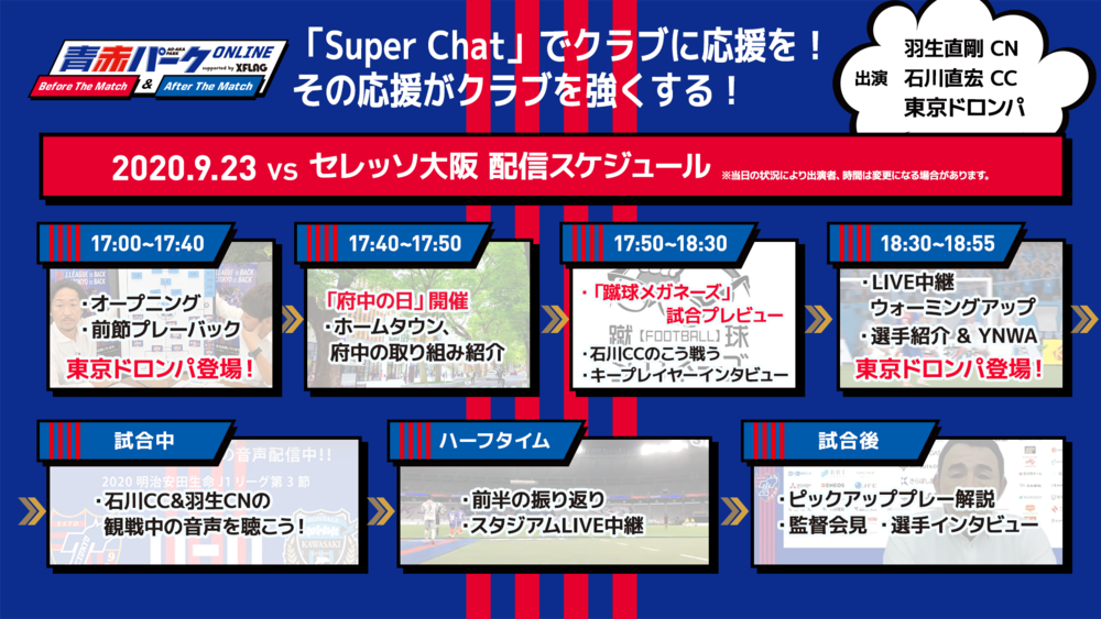FC 도쿄에서는 STAY WITH TOKYO 정책의 일환으로 J1리그 경기 전후에 YouTube【FC 도쿄 공식 채널】에서 LIVE 방송 기획 『아오아카 파크 온라인 Before The Match/After The Match supported by XFLAG』를 개최합니다.