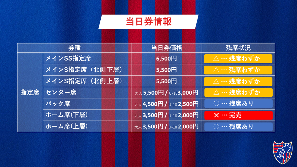 ※경기 당일에 현장에서 당일권 판매는 하지 않습니다. 티켓은 FC 도쿄(J리그 티켓)에서만 판매합니다로 하겠습니다.
