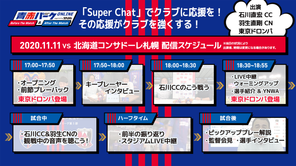 FC 도쿄에서는 STAY WITH TOKYO 정책의 일환으로 J1리그 경기 전후에 YouTube【FC 도쿄 공식 채널】에서 LIVE 방송 기획 『아오아카 파크 온라인 Before The Match/After The Match supported by XFLAG』를 개최합니다.