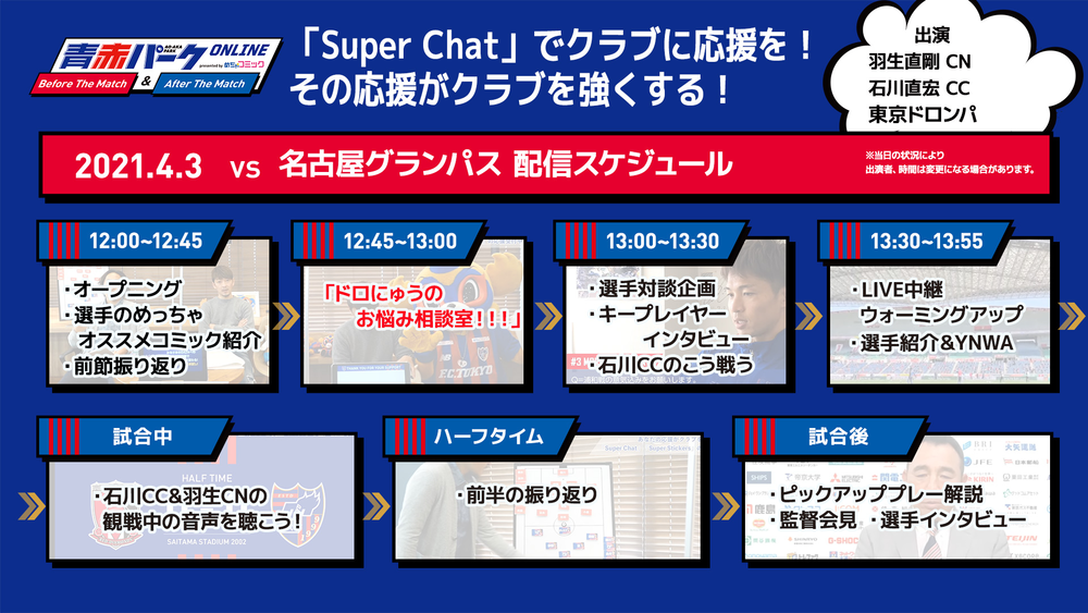 FC 도쿄에서는 J1리그 원정 경기와 일부 홈 경기의 경기 전후에 YouTube【FC 도쿄 공식 채널】에서 LIVE 방송 기획 『아오아카 파크 온라인 Before The Match/After The Match presented by 메차코믹』을 개최하고 있습니다.