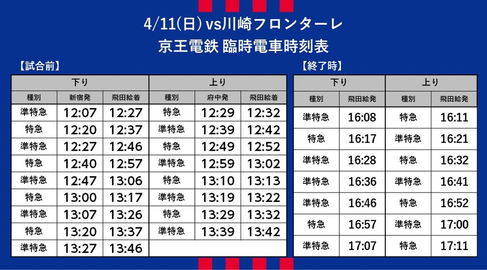 4월 11일(일) 2021 메이지 야스다 생명 J1 리그 제9절 vs 가와사키 프론탈레(14:00 킥오프/아지노모토 스타디움)에서 운행되는 임시 교통 접근(철도)에 대해 안내드립니다.