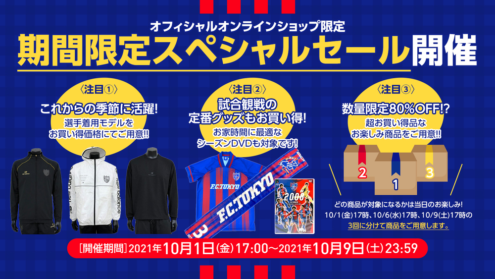 이번에 FC 도쿄에서는 클럽 창설일인 “10월 1일”(금) 17:00부터 평소 공식 굿즈를 애용해 주시는 팬·서포터 여러분께 감사의 마음을 담아, 공식 온라인샵 한정 「기간 한정 스페셜 세일」을 개최합니다!