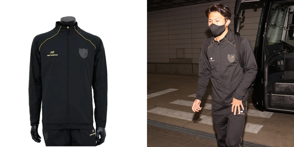 선수들이 이동할 때 착용하는 저지 소재 재킷입니다. 검은 엠블럼과 골드 파이핑이 단단한 인상을 줍니다.