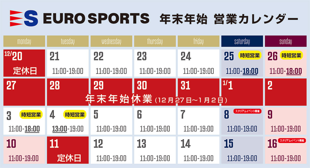 • 유로스포츠 아지노모토 스타디움점 『영업시간 변경 및 연말연시 휴업』 안내