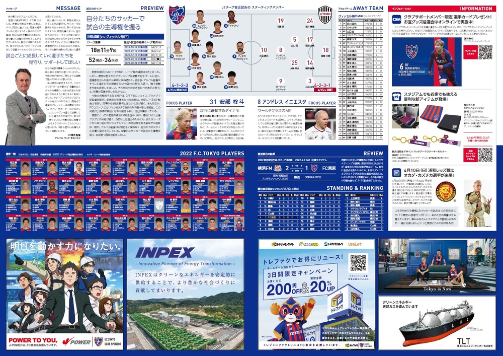 4월 6일(수) 2022 메이지 야스다 생명 J1 리그 제7절 vs 비셀 고베(19:00 킥오프/아지노모토 스타디움) 공식 매치데이 프로그램에 대해 아래와 같이 안내드립니다.