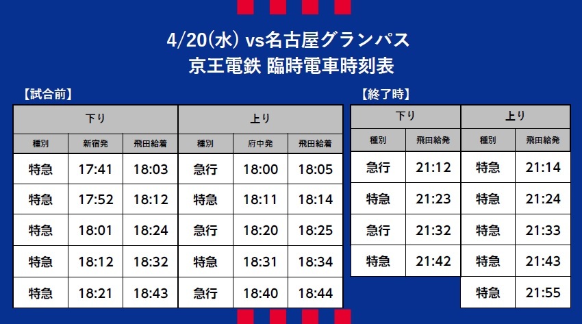 4월 20일(수) 2022 메이지 야스다 생명 J1 리그 제2절 vs 나고야 그램퍼스(19:00 킥오프/아지노모토 스타디움)에서 운행되는 임시 교통 접근(철도), 셔틀버스·노선버스에 대해 안내드립니다.