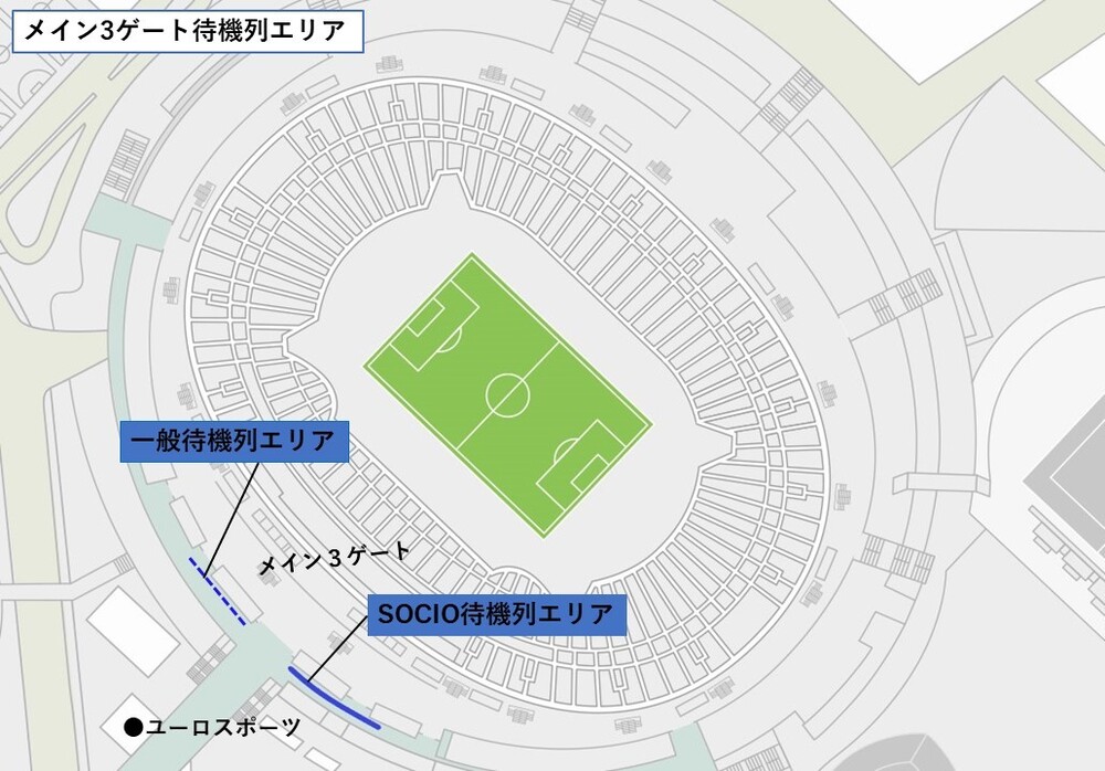 ※SOCIO 개문부터 일정 시간 동안은 게이트별로 입장 가능한 좌석 종류를 제한하고 있습니다. 또한 개문 직후에는 콩코스 내 통행이 제한되어 북 사이드 스탠드⇔백 스탠드 간 통과가 불가능합니다. 일찍 입장하시는 분은 본인의 좌석 종류와 입장 가능한 게이트를 확인하신 후 대기열 구역에 줄을 서서 입장해 주시기 바랍니다.