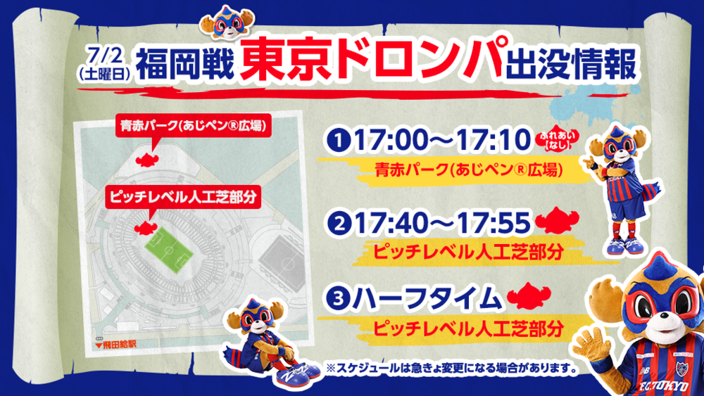 7월 2일(토) 2022 메이지 야스다 생명 J1리그 제19절 vs 아비스파 후쿠오카(18:00 킥오프/아지노모토 스타디움)에 도쿄 도롱파가 아래와 같이 나타납니다.