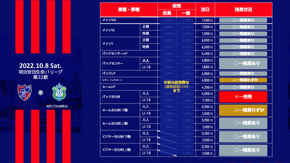 ※경기 당일 현장에서 당일권 판매는 하지 않습니다. 티켓은 FC 도쿄(J리그 티켓)에서만 판매합니다.