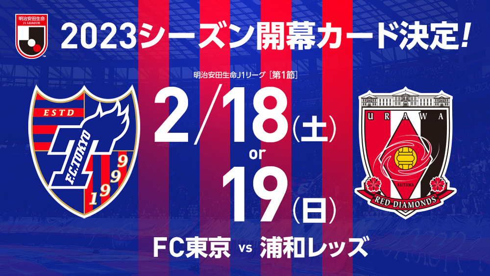 2023 메이지 야스다 생명 J1 리그 개막 카드 결정! 2022/12/23 클럽 소식 2023 메이지 야스다 생명 J1 리그 제1절 대진 카드가 결정되었으므로 알려드립니다. 【제1절】・대전 카드:FC 도쿄 vs 우라와 레즈・개최일:2월 18일(토) 또는 19일(일) 또한, 경기장 및 킥오프 시각 등의 자세한 내용은 1월 20일(금)에 경기 일정란에서 알려드리겠습니다.