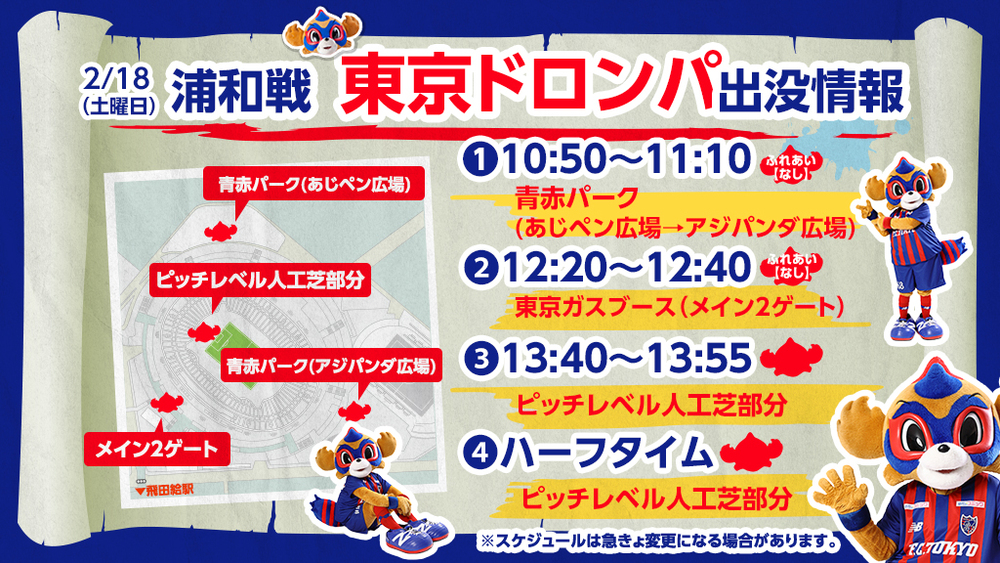 2월 18일(토) 2023 메이지 야스다 생명 J1리그 제1절 vs 우라와 레즈 (14:00 킥오프/아지노모토 스타디움)에 도쿄 도롱파가 아래와 같이 나타납니다. 꼭 기대해 주세요!