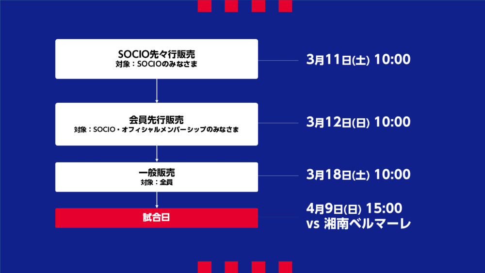 3월 11일(토)부터 SOCIO 선선행 판매를 시작합니다. SOCIO 여러분은 회원 가격으로 구매하실 수 있습니다(1경기 4매까지).