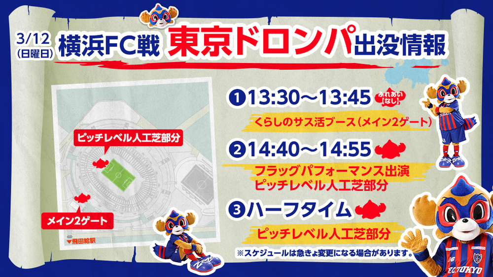 3월 12일(일) 2023 메이지 야스다 생명 J1리그 제4절 vs 요코하마 FC (15:00 킥오프/아지노모토 스타디움)에 도쿄 도롱파가 아래와 같이 나타납니다. 꼭 기대해 주세요!