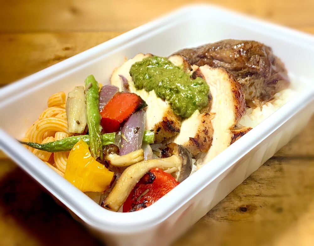 ・돼지고기 적포도주 조림과 그릴 치킨 바질 민트 소스 사전 판매 1,344엔 / 매장 판매 1,200엔