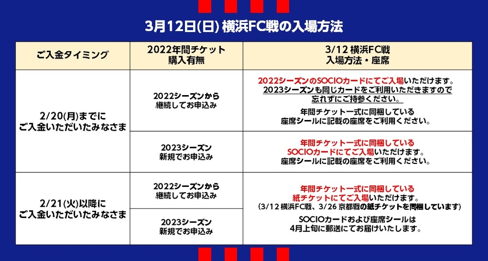 또한, 경기장에서 수령하시는 분들 중에서도 입금 시기에 따라 3월 12일(일) 요코하마 FC전 입장 방법이 다르므로 함께 확인해 주시기 바랍니다.