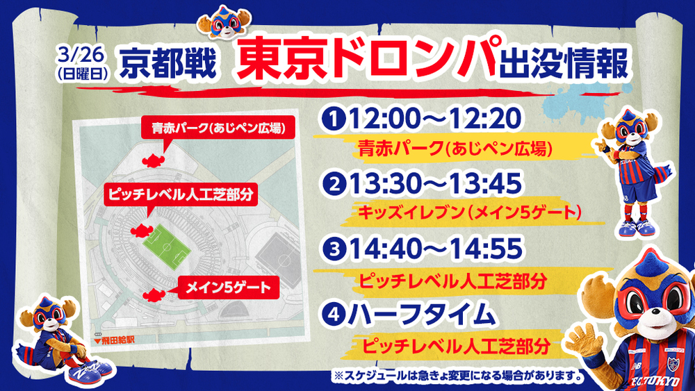3월 26일(일) 2023 J리그 YBC 르방컵 그룹 스테이지 제2절 vs 교토 산가 FC(15:00 킥오프/아지노모토 스타디움)에 도쿄 도롱파가 아래와 같이 나타납니다.